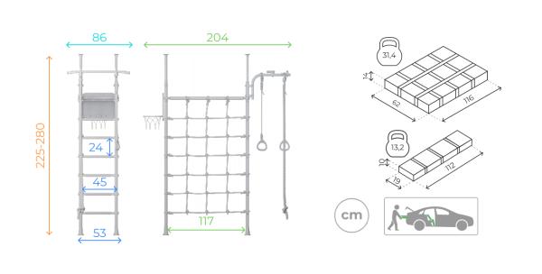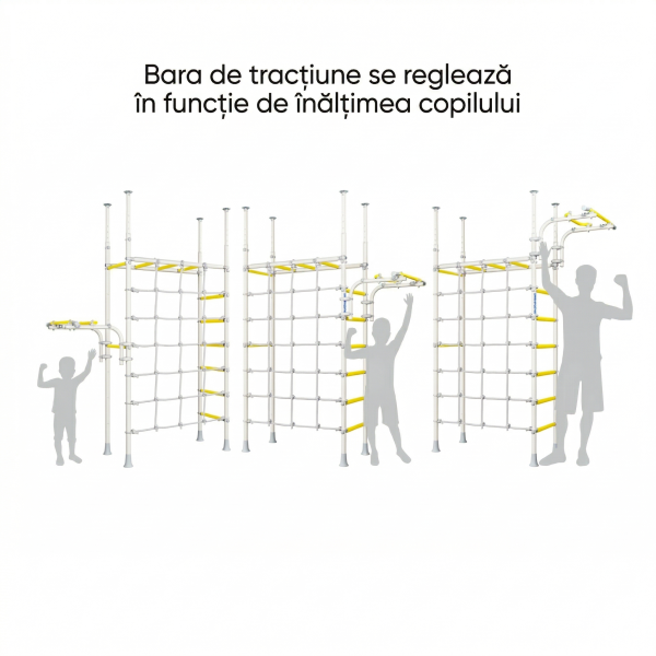 playBARS R4- COMPLEX ȘPALIER SUEDEZ TIP INSULĂ MULTIFINCȚIONAL DIN METAL PENTRU COPII - GIMNASTICĂ ȘI CĂȚĂRAT - INTERIOR Specificații Tehnice (Caracteristici) playBARS R4: Parametru Detalii Tehnice Tip fixare Prin presiune (între podea și tavan) Volum ambalaj 0,101 m³ / 0,021 m³ Greutate cu ambalaj 31,4 kg / 13,2 kg Sarcina maximă admisă (complex) 100 kg (testat la o sarcină de 200 kg) Sarcina maximă pe bara de tracțiuni 100 kg Sarcina maximă accesorii suspendate 50 kg Tip treaptă Masaj (suprafață texturată antiderapantă) Dimensiuni colet nr. 1 116 x 53 x 14 cm Dimensiuni colet nr. 2 112 x 19 x 10 cm Distanța între axele stâlpilor 49 cm Dimensiuni de gabarit 204 x 86 cm Înălțime reglabilă 225 – 280 cm Tip ambalaj Cutie de carton Versatilitate și Ajustare • Bară de tracțiuni reglabilă: Bara orizontală se fixează la orice înălțime dorită cu ajutorul unor cleme de siguranță robuste, permițând culisarea pe verticală pe cadrul complexului. • Rukohod (Scară orizontală): Poate fi montat la înălțimea optimă, adaptată perfect staturii copilului dumneavoastră. Dotări și Accesorii Incluse Modelul playBARS R4 vine echipat cu o gamă extinsă de accesorii suplimentare: • Frânghie de cățărat (Cordel); • Inele de gimnastică; • Panou de baschet; • Plasă de cățărat: Realizată din șnur de înaltă rezistență, aceasta este instalată între cei doi stâlpi principali la lățime maximă. Personalizare pentru cei mici Pentru copiii de vârstă fragedă, puteți adăuga la acest ansamblu un leagăn. Acesta se poate fixa pe scara orizontală (rukohod), după demontarea plasei de cățărat și coborârea barei la înălțimea recomandată de 1,2 m. Beneficii: Cu ajutorul complexului sportiv R4, tinerii sportivi își dezvoltă coordonarea, agilitatea și forța fizică chiar în confortul propriei camere!